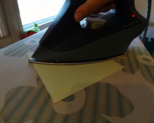 Now, this step is important. When preparing to ironing on the vinyl side of the fabric, make sure to place the paper backing you peeled off between the fabric and your iron. If you put the iron directly on the vinyl it will instantly melt into a globby mess. *** I just nicked a corner of the outside, but the speed of meltage was really quite shocking @_@ *** So I repeat, DO NOT PLACE YOUR IRON DIRECTLY ON THE VINYL.